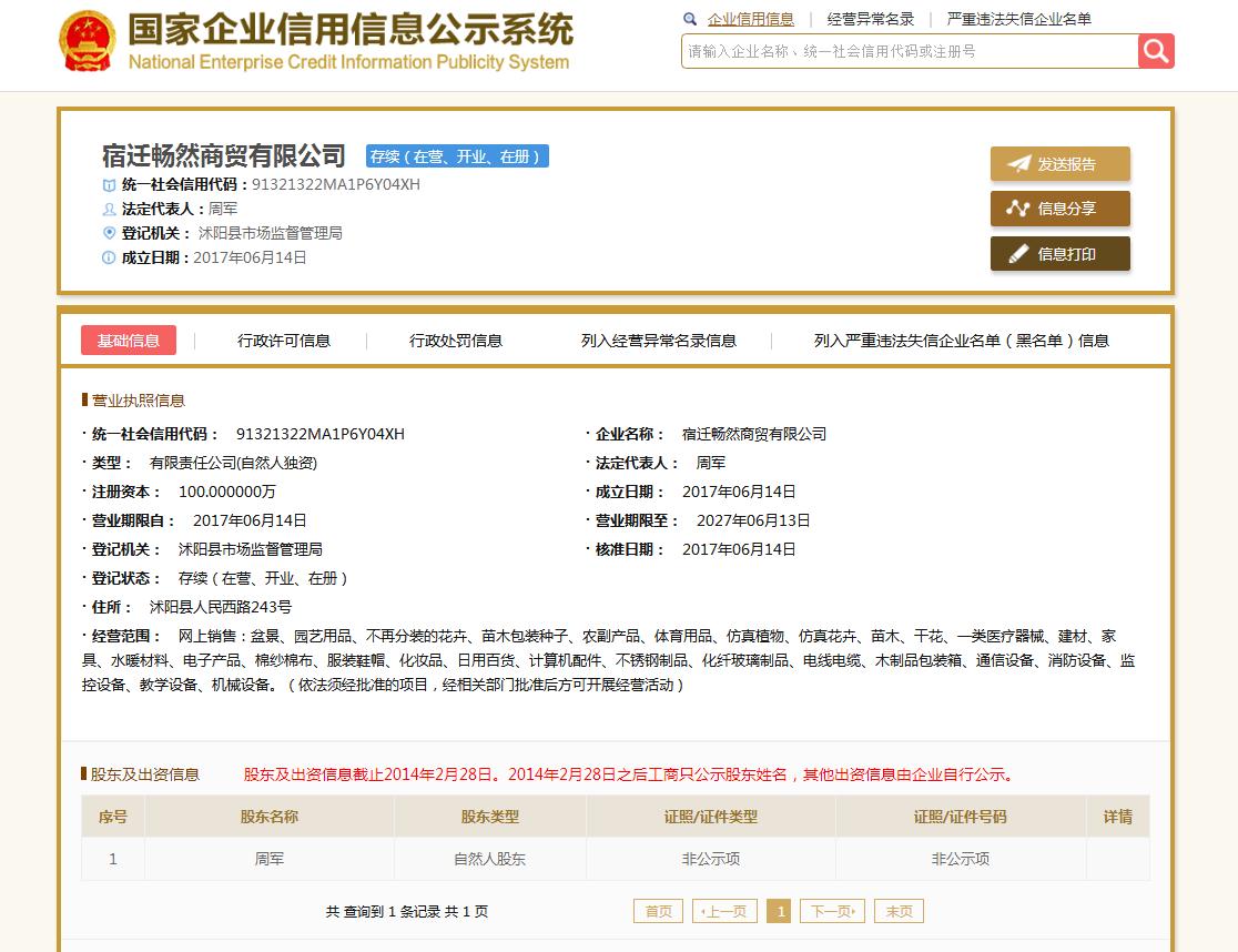 被投诉公司:宿迁畅然商贸有限公司 统一社会信用代码:91321322MA1P6Y04XH 法人:周军 联系电话:无 工商执照地址:江苏宿迁市沭阳县人民西路243号