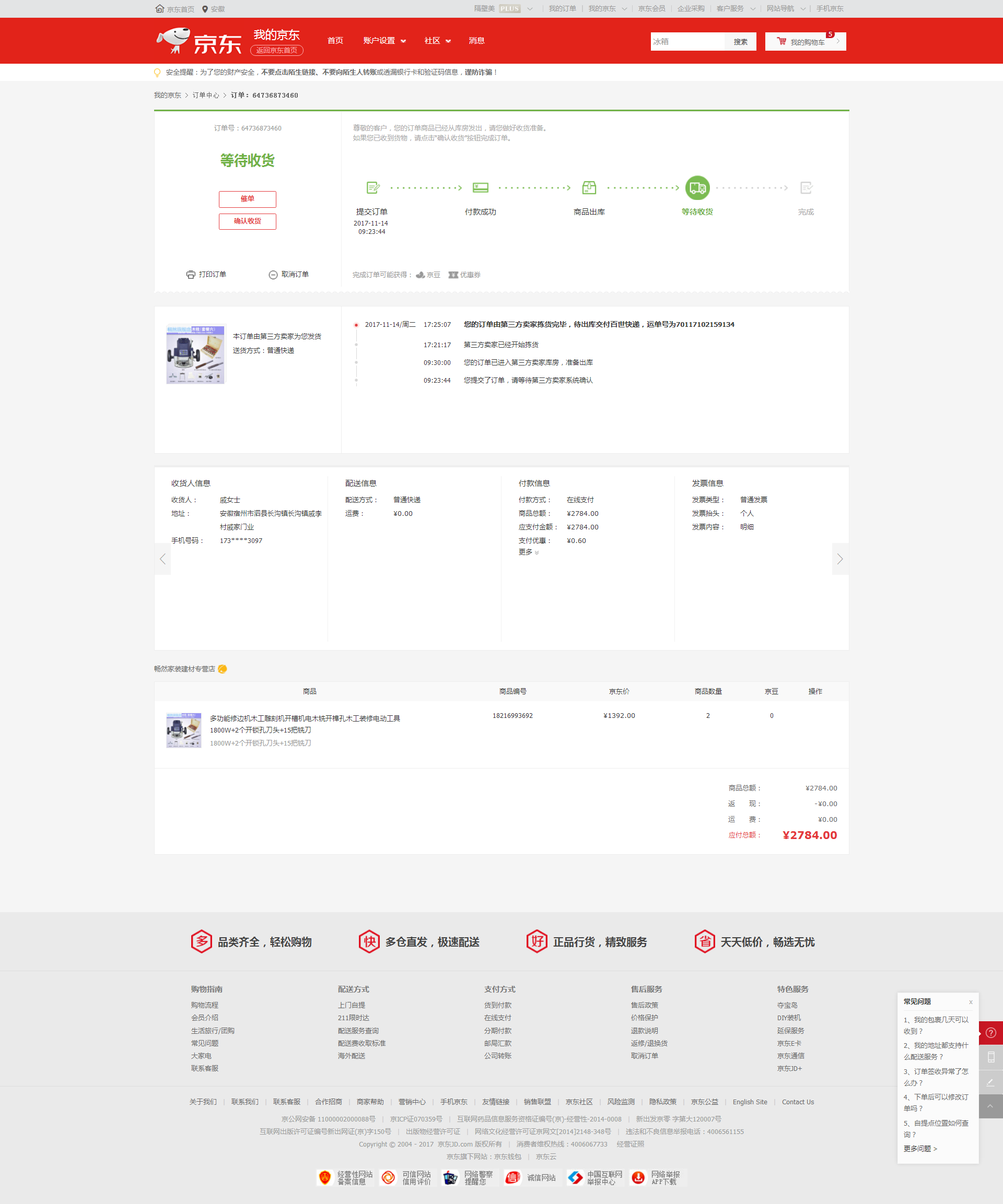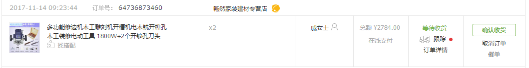 2017年11月14日,本人生活需要在京东商城购物,已2784元的价格在宿迁畅然商贸有限公司开设的京东店铺“畅然家装建材专营店”购买了2台商品为多功能修边机木工雕刻机开槽机电木铣开榫孔木工装修电动工具 1800W+2个开锁孔刀头.型号:TJ-3612。订单编号:64736873460.