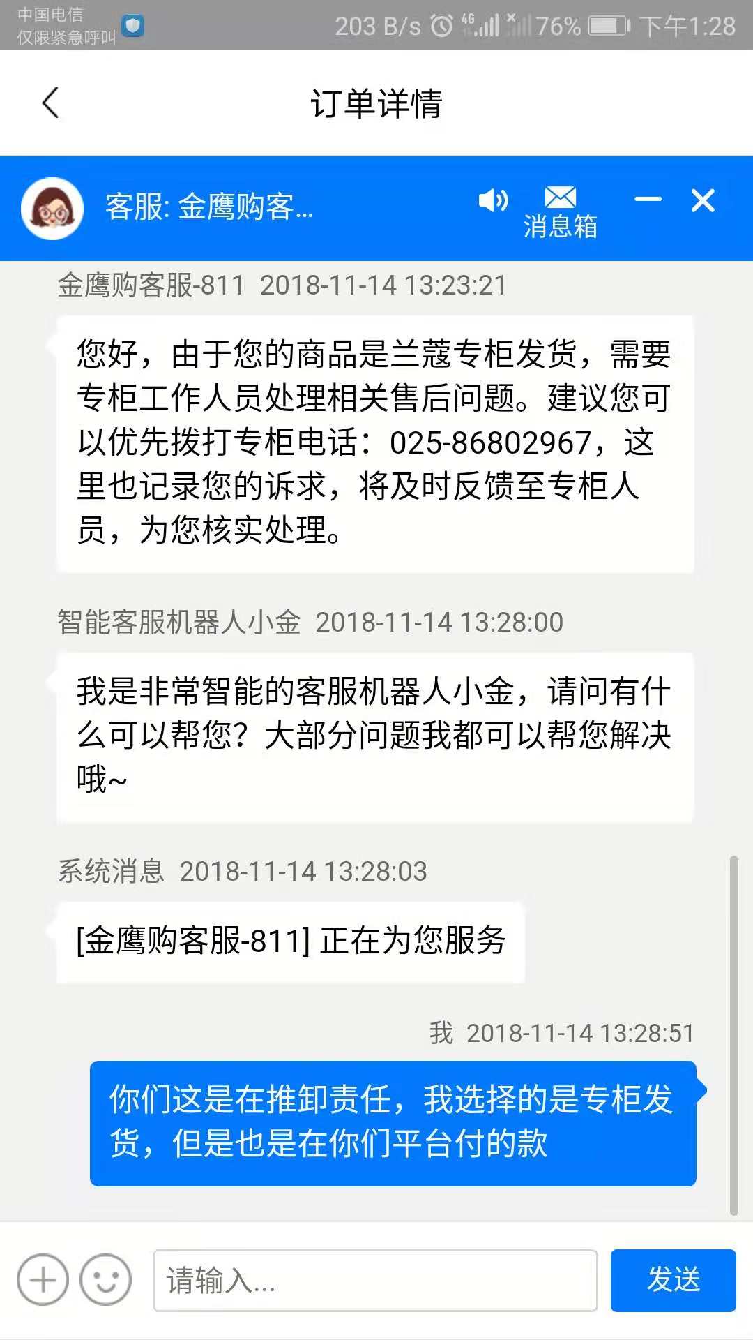 本人于2018年11月11日,在金鹰购购买了兰蔻小黑安瓶肌底修护舒缓精华液礼盒,价值587元,11号当天金鹰购显示发货,物流单号,顺丰245066320488,至今没有物流揽收记录,本人质疑虚假发货,联系金鹰购客服称是南京新街口金鹰专柜发货,提供南京新街口金鹰专柜电话025-86802967让我联系,联系兰蔻专柜之后称金鹰购跟他们不是一个部门,还是让我联系金鹰购,这样来回踢皮球,我钱也付了,货也没收到,这种收了钱却虚假发货的行为严重侵犯了我们消费者的合法权益, 本人在此坚决维权到底。诉求全额退款!